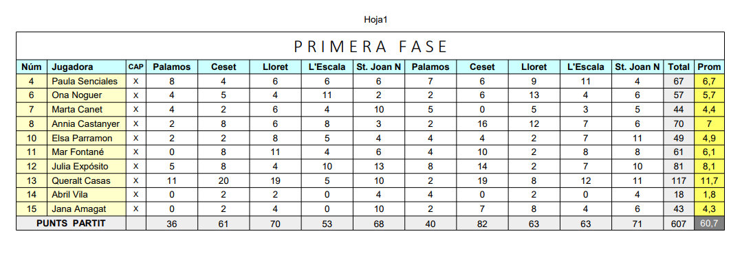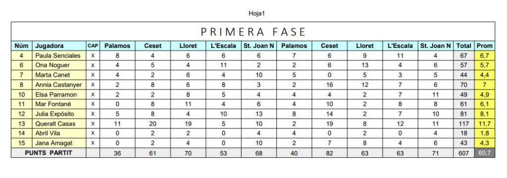 En el següent esquema es veuen reflexades les puntuacions de cada partit, el total i el promitg de cada jugadora en aquesta primera fase. És un esquema només de puntuacions, evidentment hi ha jugadores que potser no aporten tants punts però que defensivament donen molt de sí. o altres facetes del joc que són igual d’importants i que sumen en favor de l’equip. Felicitats a cadascuna de les noies!