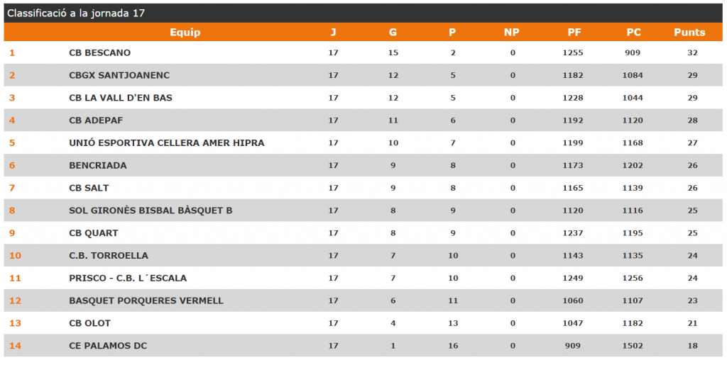 Victòria important del primer equip de la Unió Esportiva Cellera Amer, una victòria contra el segon classificat del nostre grup i que ens permet mantenir la cinquena posició de la lliga a una sola victòria del quart classificat i a dues del segon i tercer, precisament el pròxim dissabte visitem la pista del quart classificat, l’Adepaf Figueres, un partit molt complicat però que l’equip d’en Pere Garangou ja sap que és derrotar-lo perquè a la primera volta els vàrem aconseguir vèncer amb una actuació memorable d’en Francis Gallardo que va aconseguir 8 o 9 triples i enfonsar l’equip empordanès. De totes maneres cada partit és una història diferent i evidentment és una pista que la victòria es paga molt cara.
