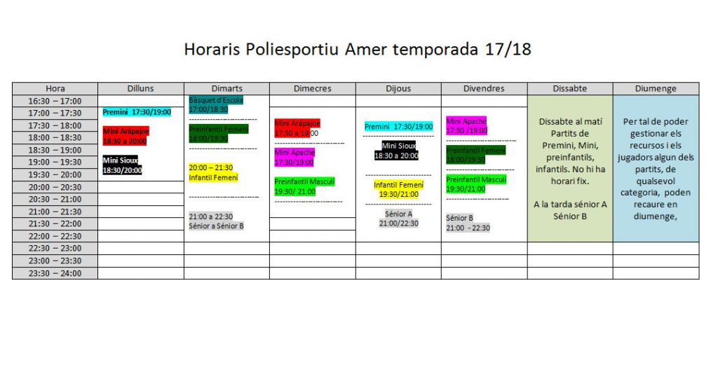 A dia 21 d’Agost de 2017 us presentem els horaris d’entrenament dels diferents equips de la Unió Esportiva Cellera Amer. En base a aquest “planing” esperem fer poques modificacions, com a molt alguna correcció. Si en els propers dies o hores hi ha algun canvi per petit que sigui us informarem per tots els mitjans possibles.