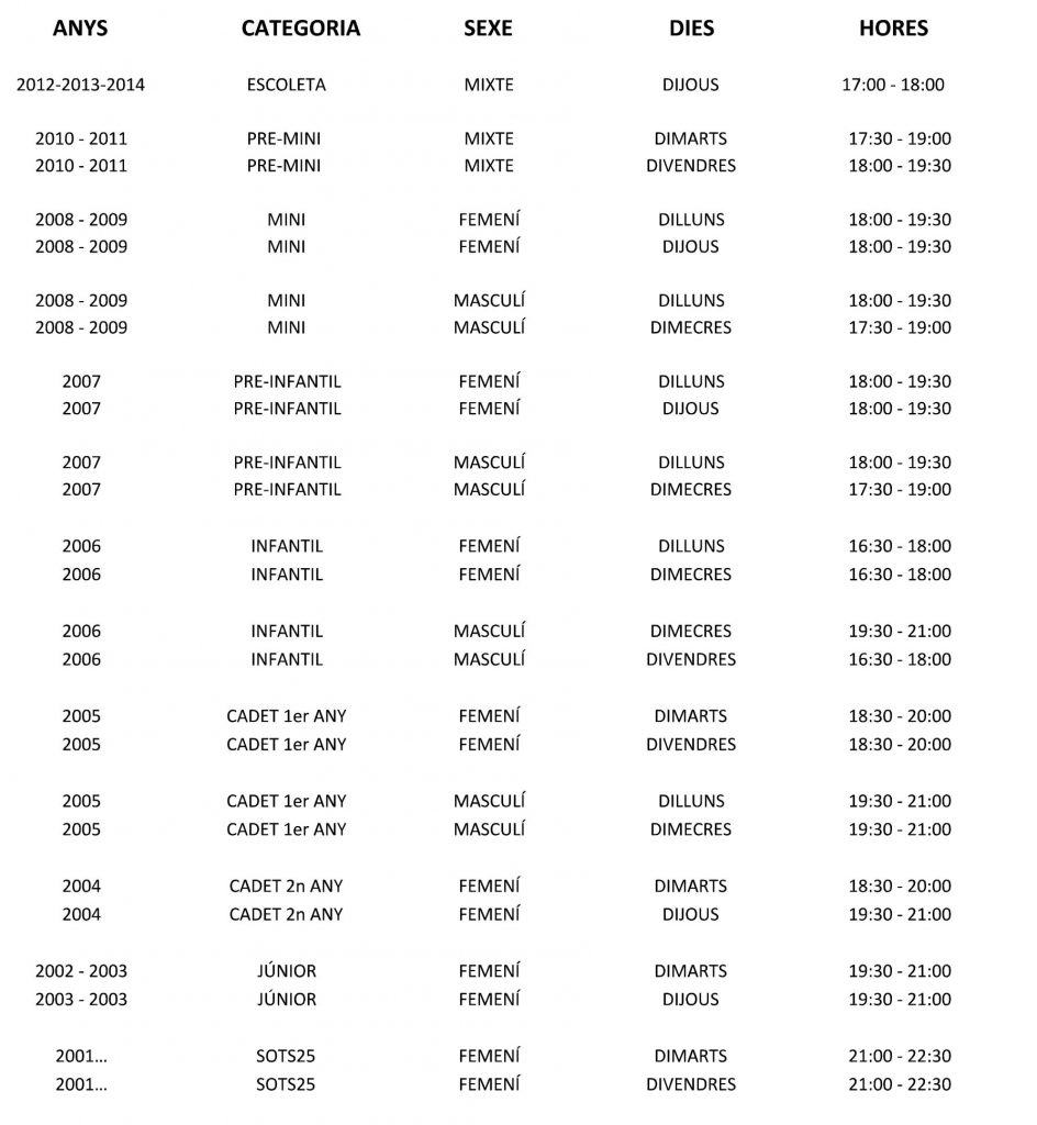 Disposem de 14 entrenadors i director tècnic i esportiu i tan la preparació tècnica com la física vénen preparades des de l’inici de la temporada amb la finalitat d’aconseguir els objectius preestablerts que són com a mínim els requeriments bàsics que comporta cada categoria, amb l’assoliment del coneixement i del desenvolupament tècnic que li pertoca a cada nen o nena segons l’edat.